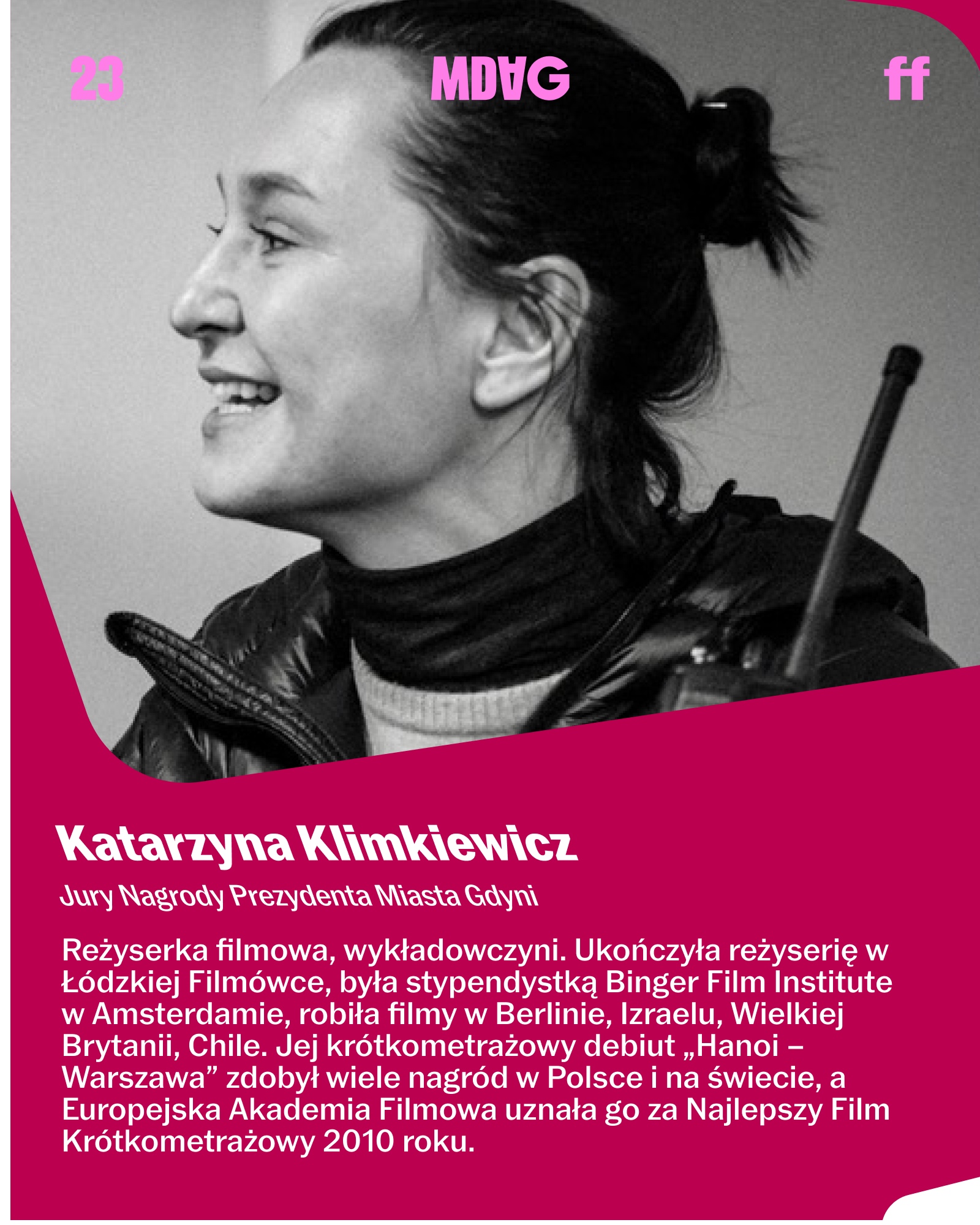 Katarzyna Klimkiewicz – reżyserka filmowa, wykładowczyni. Ukończyła reżyserię w Łódzkiej Filmówce, była stypendystką Binger Film Institute w Amsterdamie, robiła filmy w Berlinie, Izraelu, Wielkiej Brytanii, Chile. Jej krótkometrażowy debiut „Hanoi – Warszawa” zdobył wiele nagród w Polsce i na świecie, a Europejska Akademia Filmowa uznała go za Najlepszy Film Krótkometrażowy 2010 roku. Jest reżyserką nagradzanych w Polsce i na świecie filmów jak „Zaślepiona” czy „Wyspa”. „Bo we mnie jest seks” – jej ostatni film wszedł do kin w 2021, otrzymał na Festiwalu Polskich Filmów Fabularnych w Gdyni nagrodę za główną rolę kobiecą dla Marii Dębskiej, a także nagrodę Orła na za scenografię dla Wojciecha Żogały. Ma na swoim koncie również realizację dla Teatru TV oraz seriali.