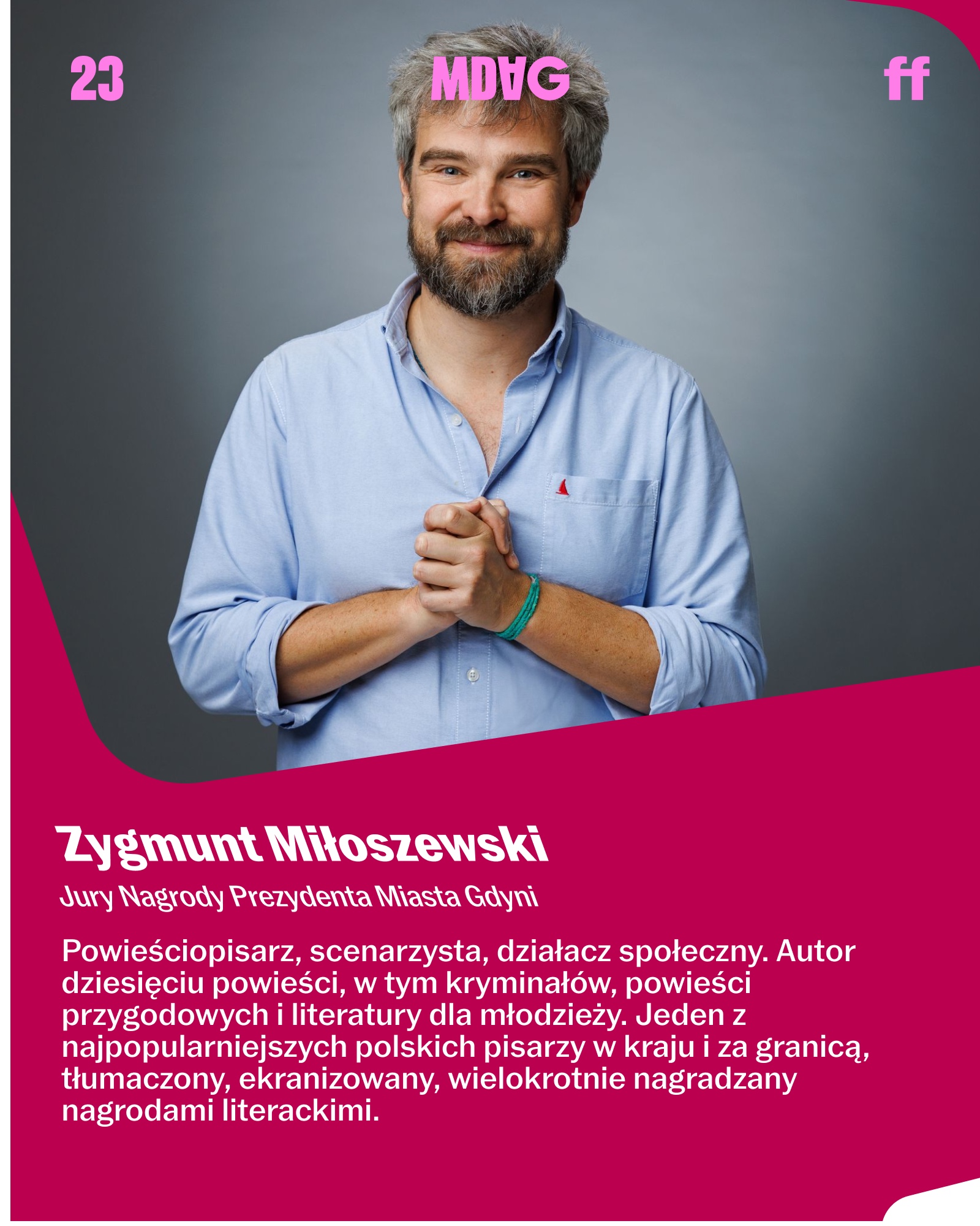 Zygmunt Miłoszewski – powieściopisarz, scenarzysta, działacz społeczny. Autor dziesięciu powieści, w tym kryminałów, powieści przygodowych i literatury dla młodzieży. Jeden z najpopularniejszych polskich pisarzy w kraju i za granicą, tłumaczony, ekranizowany, wielokrotnie nagradzany nagrodami literackimi. Członek założyciel branżowego stowarzyszenia pisarskiego Unia Literacka. Żeglarz, podróżnik, poszukiwacz przygód. Uczy struktur fabularnych oraz sztuki pisania w ramach studiów literackich na Uniwersytecie Gdańskim.