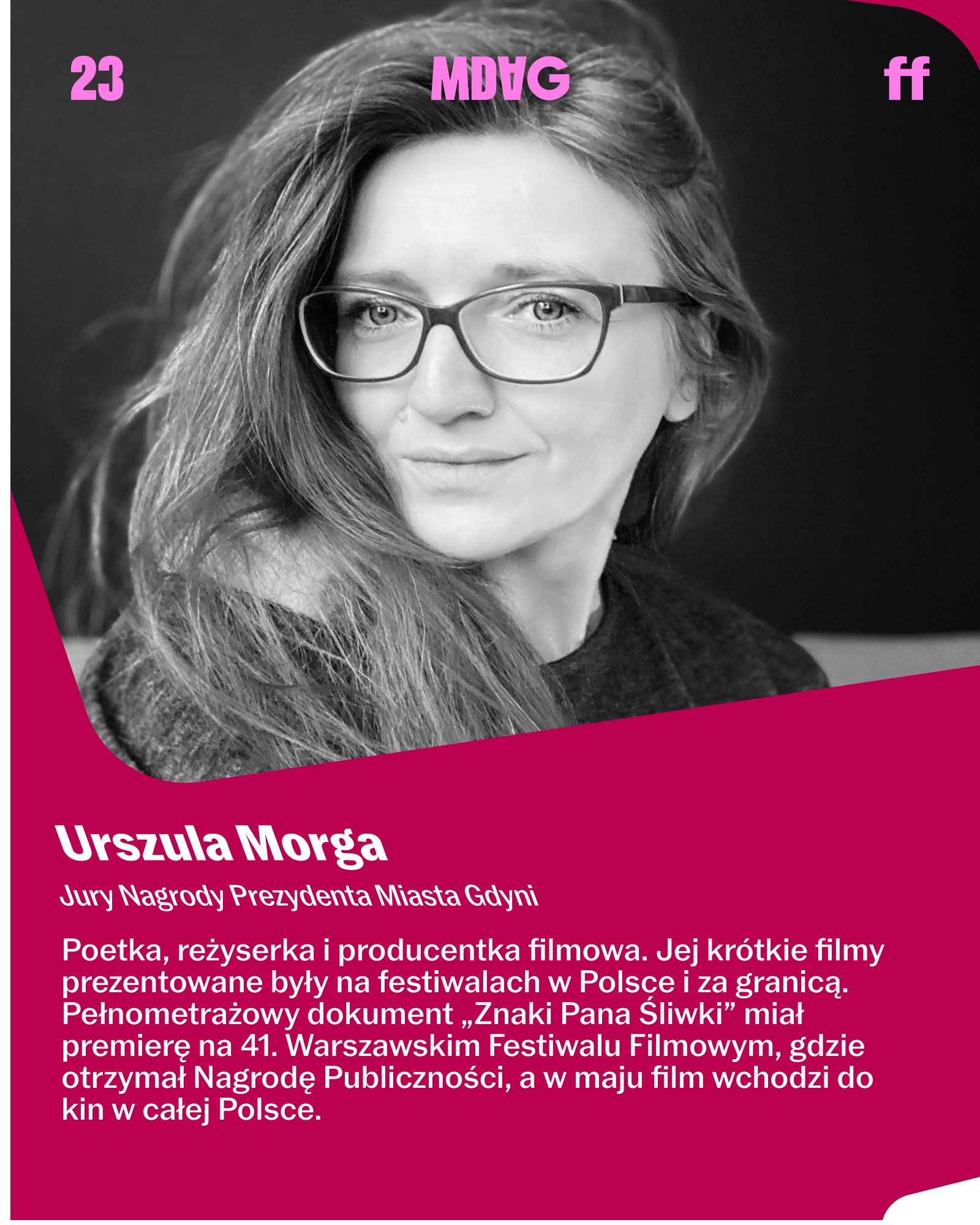 Urszula Morga – poetka, reżyserka i producentka filmowa. Jej krótkie filmy prezentowane były na festiwalach w Polsce i za granicą. Pełnometrażowy dokument „Znaki Pana Śliwki” miał premierę na 41. Warszawskim Festiwalu Filmowym, gdzie otrzymał Nagrodę Publiczności, a w maju film wchodzi do kin w całej Polsce. Laureatka XV Ogólnopolskiego Konkursu Poetyckiego im. Janusza Różewicza. W 2024 zadebiutowała tomem „fundamenty”, za który w 2025 otrzymała Nagrodę Galion Gdyński oraz nominacje do Pomorskiej Nagrody Literackiej „Wiatr od morza”. Autorka książek dla dzieci „Panda Bonia” i „O rzece, która szukała morza”. Od ponad 20 lat mieszka i pracuje w Gdyni, gdzie prowadzi studio animacji Esy-floresy.